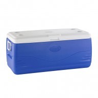 - Capacidad de volumen: 100QT, 141.90 litros. - Mantiene el hielo hasta 6 días a temperaturas de hasta 90 °C. - Tiene una capacidad para 223 latas. -Tiene un desagüe en línea resistente a las fugas para drenar fácilmente sin inclinar la hielera. -Tapa con bisagras para un acceso fácil, con una sola mano. - 2 agarradores que se encargan de una elevación fácil y llevan un diseño que ahorra espacio. - Portavasos moldeados en la tapa para mantener las bebidas estables. - Aislamiento de bajo CO2 para la reducción de las emisiones de carbono procedentes de la fabricación de su espuma. - Color: azul